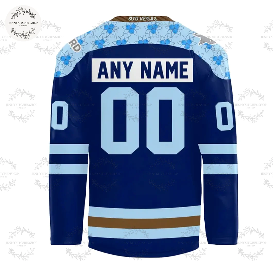 Transitioning to the shoulders, you’ll discover a brilliant light blue yoke, adorned with a captivating repeating pattern. This pattern, a blend of intricate geometric shapes and stylized floral elements, is my interpretation of the “Sudvegas” aesthetic. It could be the shimmering lights of a casino, the delicate frost patterns of a Sudbury winter, or a subtle nod to a winning hand. It adds a layer of sophistication and visual interest that elevates this jersey beyond typical sports merchandise. This detail, often overlooked by competitors, is where the “Vegas” part of “Sudvegas” truly shines, offering a touch of unexpected glamour to our rugged northern roots.