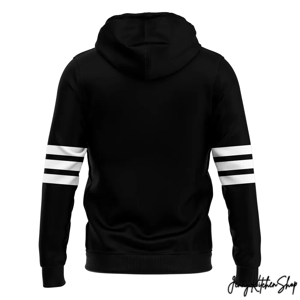 But the design story doesn’t end there. Elevating the hoodie’s athletic aesthetic are the three iconic white stripes that boldly wrap around each sleeve. Positioned midway down the forearm, these stripes are a classic nod to athletic heritage and team spirit, instantly recognizable and universally cool. They break up the black canvas, adding a dynamic visual rhythm and a touch of traditional sports style that perfectly complements the modern, mythical logo. Our designer carefully placed these, ensuring they add a touch of classic varsity appeal without overwhelming the central, captivating logo. Unlike many generic hoodies that feature simple, unadorned sleeves, these stripes embody a subtle design choice that enhances the overall athletic and spirited feel, making it distinctly a piece for the committed fan.