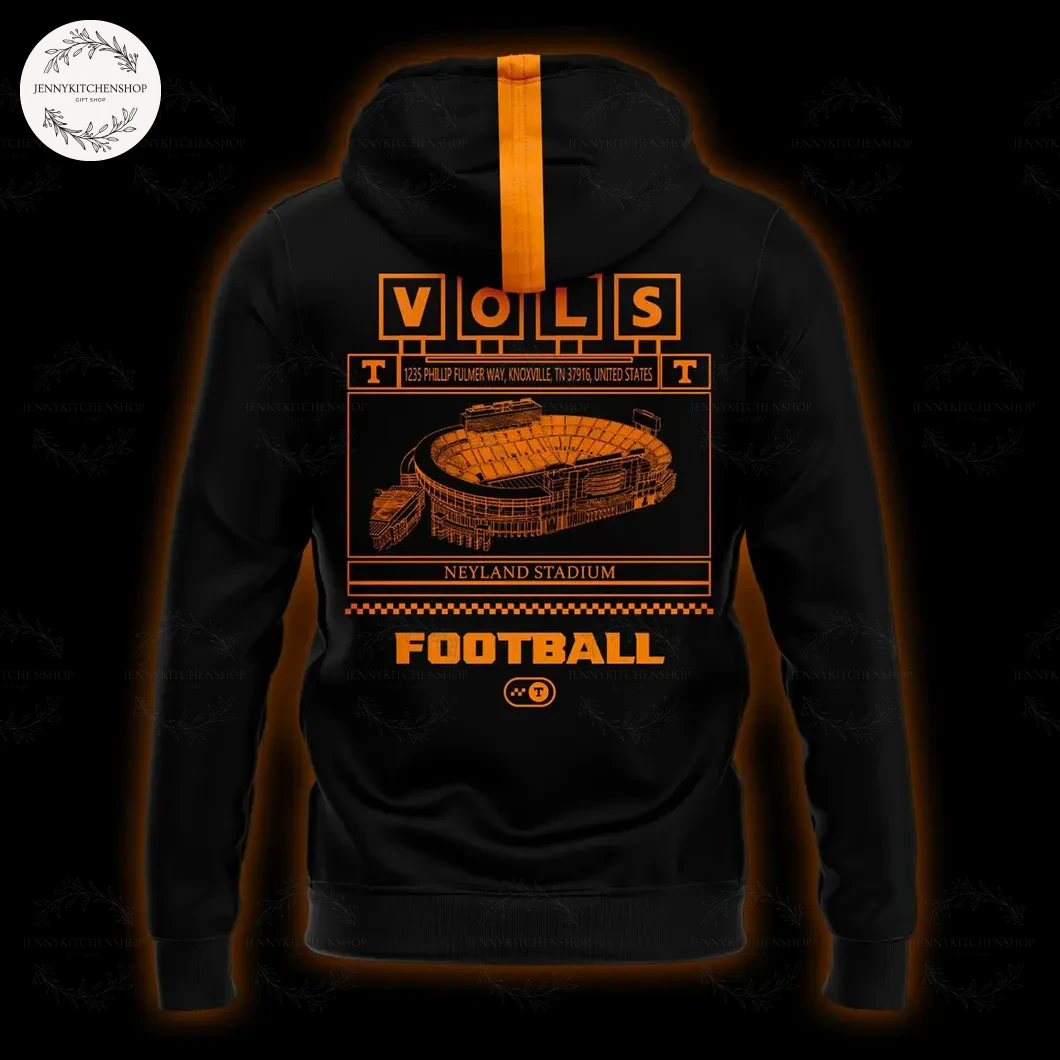 Turn around, and the narrative continues, unfolding a profound homage to the heart of Vol Nation. The back proudly displays “VOLS” in prominent, crisp orange block lettering across the shoulders, a direct and powerful statement of allegiance. Below this, an intricately detailed architectural illustration of Neyland Stadium is rendered in stunning orange, appearing almost like a blueprint or an illuminated tribute. Every arch, every tier, every detail of our sacred ground is meticulously captured, connecting you directly to the physical home of countless memories. This isn’t a generic stadium graphic; it’s a loving, precise depiction, complete with the specific address: “1295 PHILLIP FULMER WAY, KNOXVILLE, TN 37916, UNITED STATES.” This detail grounds the design in authentic heritage, a subtle nod for those who truly know the grounds, a depth of connection often overlooked by competitors. Below the stadium, the word “FOOTBALL” boldly asserts our passion, framed by decorative orange lines that add a touch of vintage sports aesthetic. A matching circular ‘T’ emblem, identical to the one on the front, subtly signs off the design at the very bottom. To complete this striking aesthetic, an athletic orange strap runs down the center of the hood, a vibrant stripe of color that ensures your Vol pride is visible from every angle.