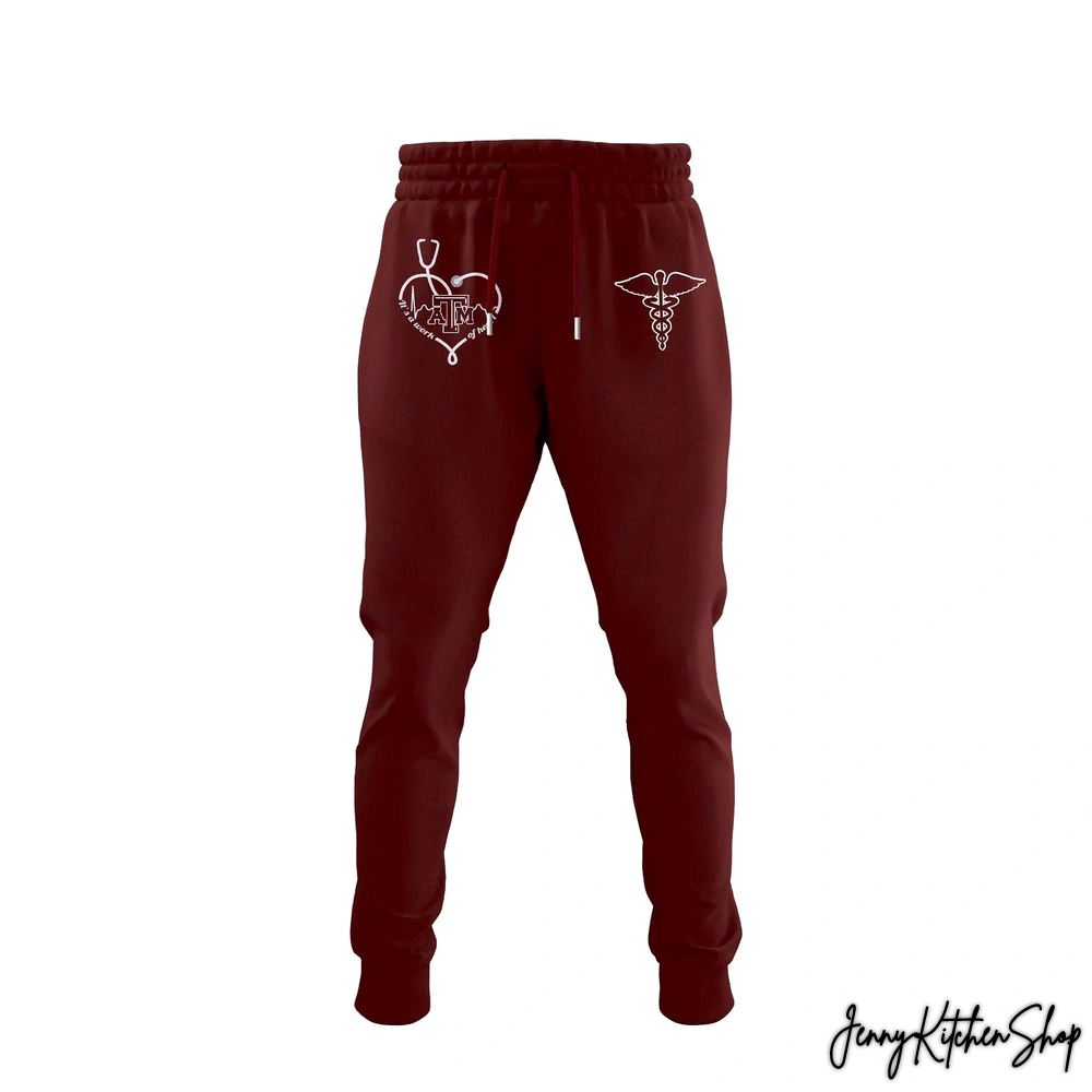 Absolutely! The distinctive stethoscope heart and Caduceus design motif is also available on complementary items such as comfortable joggers and a stylish cap, allowing you to create a complete, cohesive look that celebrates your Aggie nurse pride.