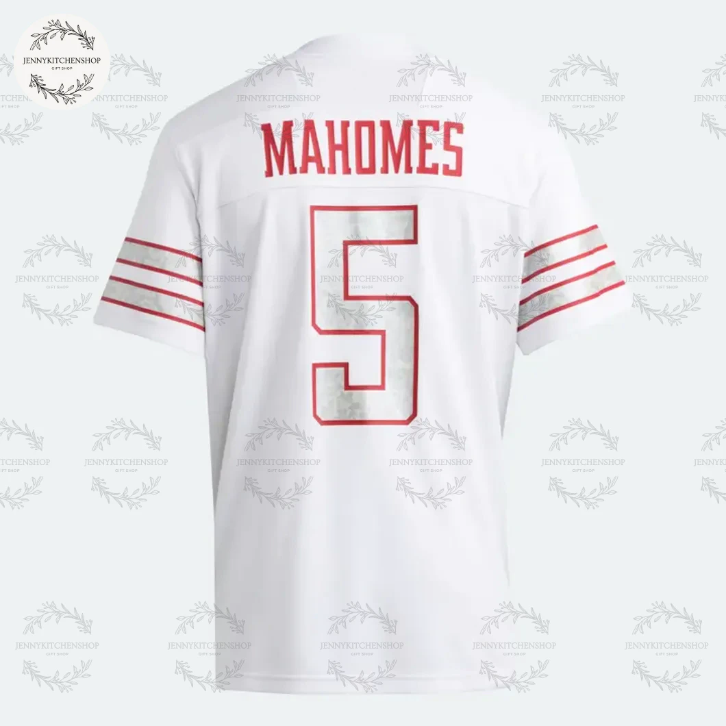 - The “MAHOMES” Nameplate – A Legacy Honored: Dominating the upper back, above the #5, is the name “MAHOMES” rendered in bold, assertive scarlet red. This isn’t just a name; it’s a tribute to a legacy-defining player, an era of unforgettable football, and the “Too Cold” moments he delivered on the field. Wearing this name means carrying a piece of Red Raider history, celebrating the spirit of excellence and the magic of number five.