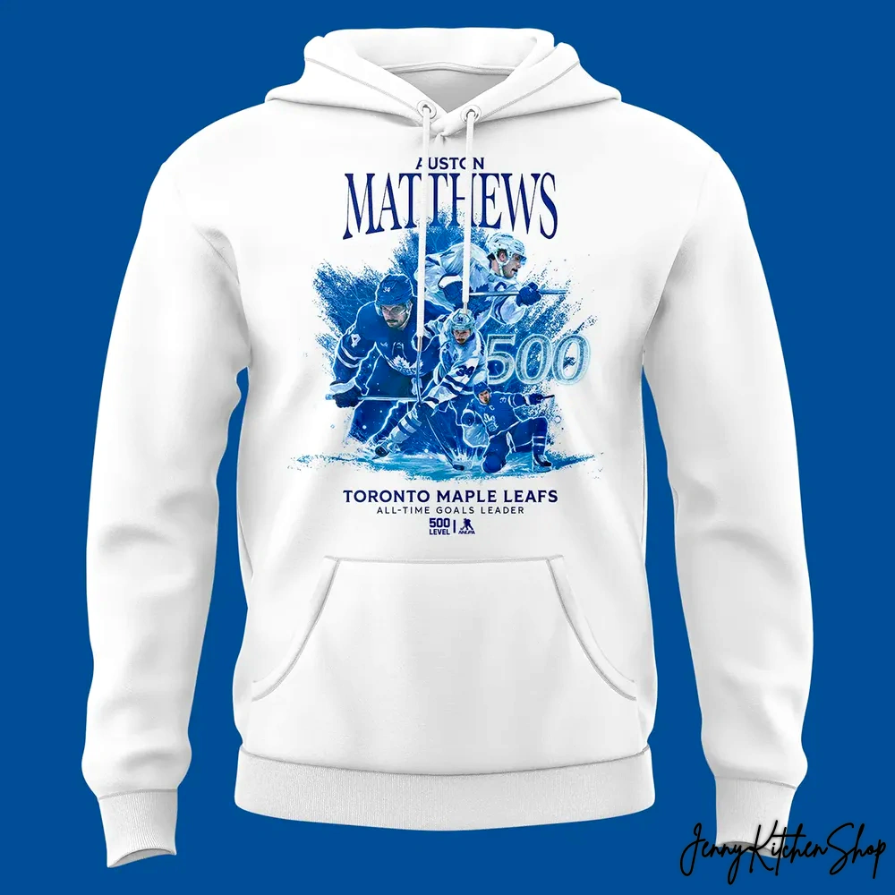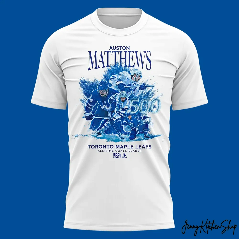 Above this captivating scene, the name “AUSTON MATTHEWS” is emblazoned in a stylized, bold font, commanding attention, a testament to his legendary status. Directly below, the monumental “500” is rendered with a shimmering, almost frosted effect, making it pop against the blue backdrop. It’s not just a number; it’s a glowing symbol of achievement, standing proud and undeniable.