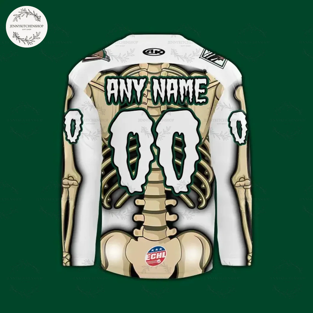 Flip the jersey around, and the spectacle continues. The back proudly displays the continuation of the spine and rib cage, providing a dramatic backdrop for the centerpiece: your customizable name and number. Rendered in a distinctive, jagged, bone-like font, “ANY NAME” and “00” are not merely printed; they are integrated into the skeletal design, giving the impression that they’re carved directly from the very bones of the jersey itself. This was a critical design choice by our team, to ensure the customization didn’t feel like an afterthought, but rather a personalized extension of the spooky theme. At the top center, the subtle “AK” logo confirms its quality and authenticity, while near the bottom, the “ECHL” logo boldly signifies its connection to the league, grounding this unique design in the competitive world of professional hockey.