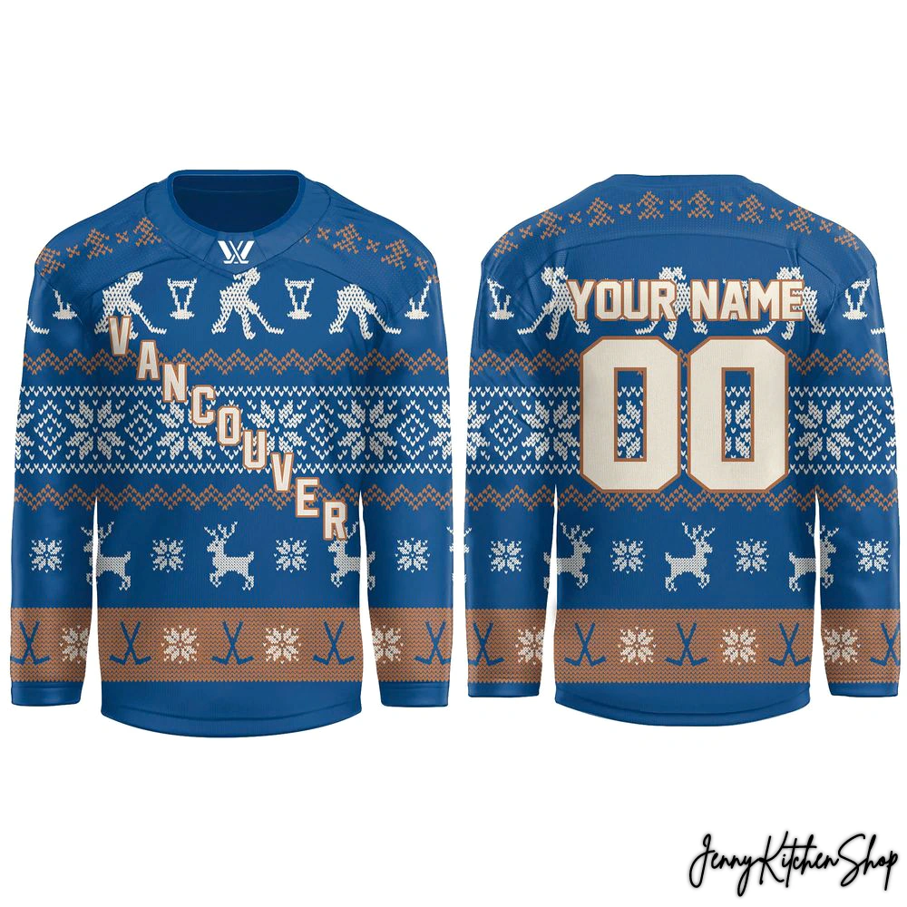 The designer’s creative journey for this piece was born from a desire to merge the raw energy of professional hockey with the cozy, communal spirit of the holidays. “I wanted to create something that felt inherently festive, something you’d wear to an ugly sweater party, but still screamed ‘hockey fan’ at the top of its lungs,” they shared. “The challenge was to make the ‘ugly sweater’ elements feel authentic and integrated, not just slapped on. Every snowflake, every deer, every hockey player silhouette was placed with intention, so it tells a story of Vancouver’s winter and our unwavering love for the game.” Unlike typical fan apparel that might just add a simple logo to a generic holiday sweater, this jersey is a holistic design, where every pattern element serves both its festive and its fandom purpose. It’s a celebration of team heritage through a unique, seasonal lens, ensuring you stand out in the best possible way.