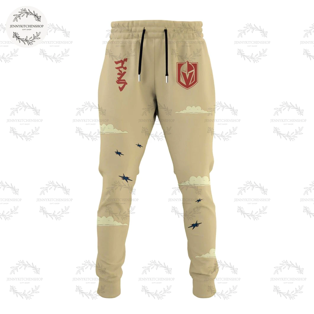 - The Backstory of Power: Turning the hoodie reveals an equally impressive and harmonious continuation of the narrative. Our beloved Golden Knights V-helmet logo, rendered in striking red and gold, commands the upper back, encircled by an evocative orange sun-like aura. It signifies the unifying power and presence of our team. Below, Godzilla takes center stage once more, perhaps in a slightly different, equally dynamic pose, his formidable spikes silhouetted against the fiery backdrop of the setting (or rising) sun. More fighter jets crisscross the sky, adding to the sense of an ongoing battle or epic display of might. The cityscape continues its detailed sprawl, creating a cohesive, immersive scene that wraps around you. The opposite sleeve mirrors the Japanese “ゴジラ” text, ensuring the Kaiju legend is celebrated from every angle.