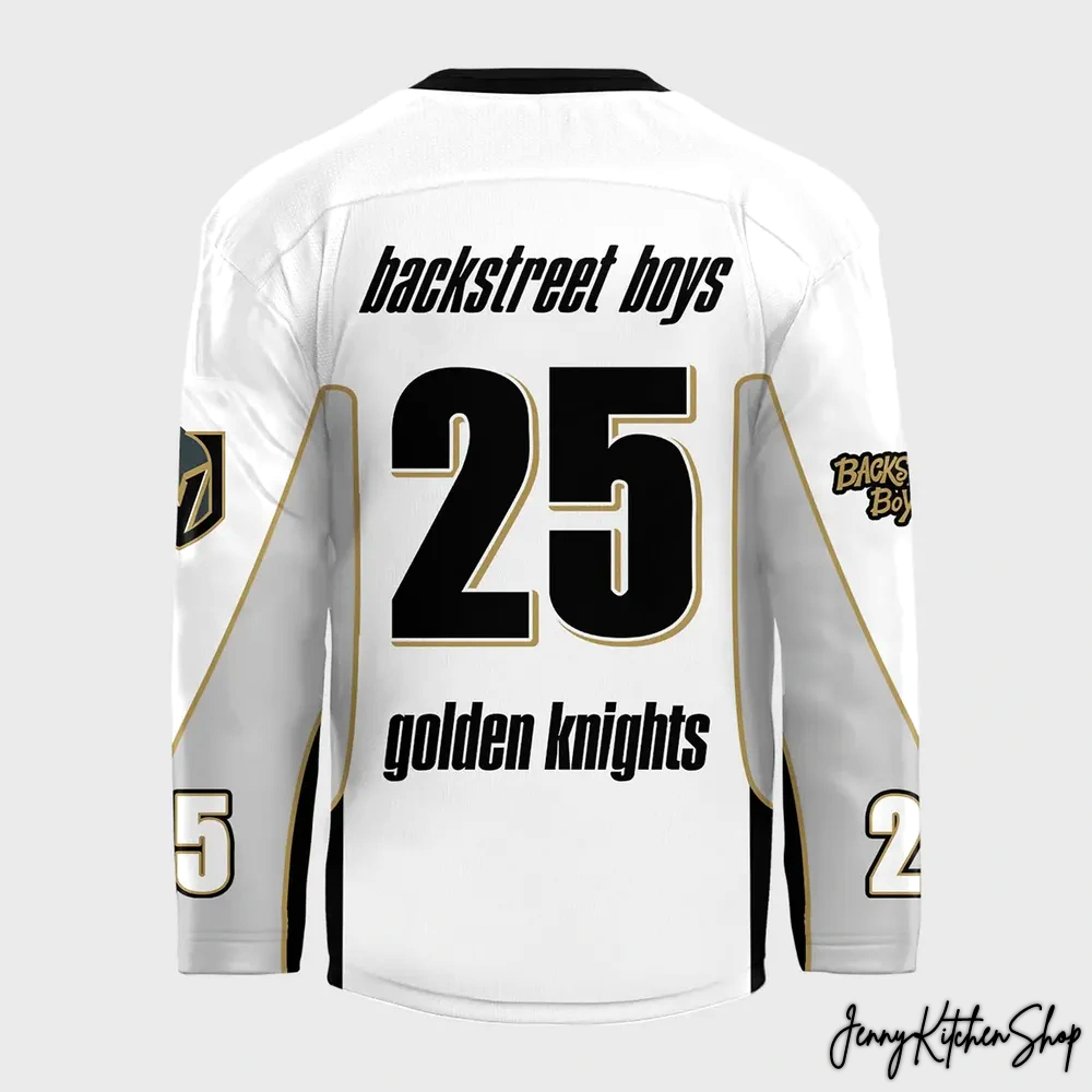 - The Backstory: Turn around, and the narrative continues. Across the upper back, “backstreet boys” is elegantly scripted in black, perfectly balanced above a colossal “25” in gold-outlined black. Below the number, “golden knights” is scripted in a similar style, creating a harmonious flow. This thoughtful arrangement means whether you’re facing the crowd or turning to celebrate, your loyalties are clear and beautifully presented. The designer’s intent here was to make the wearer feel like a player for both teams – a member of the Golden Knights and the Backstreet Boys ensemble.