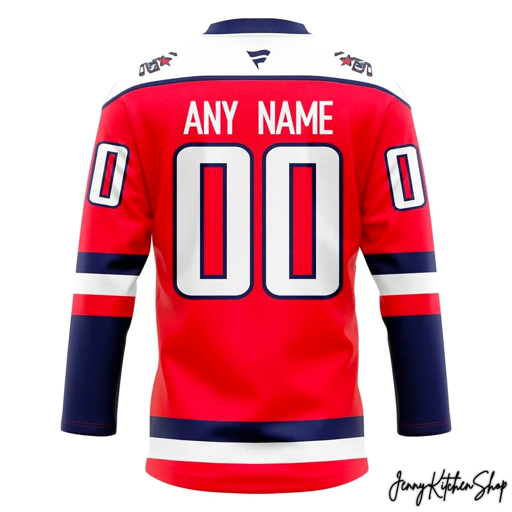 The team’s name, “CAPITALS,” is emblazoned across the chest in a dynamic, bold font. This isn’t just lettering; it’s a declaration of pride, a unified front presented with a powerful white outline that makes it pop against the red background. The styling of this text is deliberately robust, exuding strength and confidence, reminiscent of the team’s commanding presence on the ice.