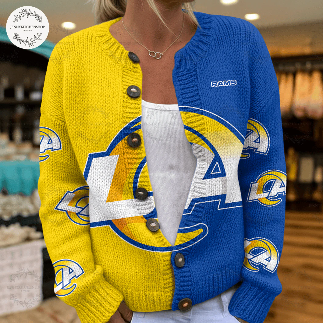 Our designer’s inspiration for this piece was rooted in the desire to bridge the gap between dedicated fandom and high-end casual wear. We wanted to create a garment that allowed you to show off your Rams pride without compromising on personal style. The split-color, split-logo concept was born from the idea of duality – the dual colors of the team, the two halves of a game, the unity of fans from all walks of life. This cardigan is designed for the true fan who appreciates both the thrill of the game and the artistry of fashion. It’s a piece that doesn’t shout its allegiance but confidently states it with sophisticated design and unique visual storytelling, something that generic fan sweaters simply can’t achieve. This design is a tribute to the team’s heritage, a nod to its vibrant future, and a celebration of the passionate community that stands behind it.